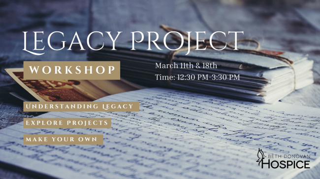 Join us for a two-part Legacy Workshop at Beth Donovan Hospice, designed to help you explore the significance of legacy and create a meaningful project to share with your loved ones.