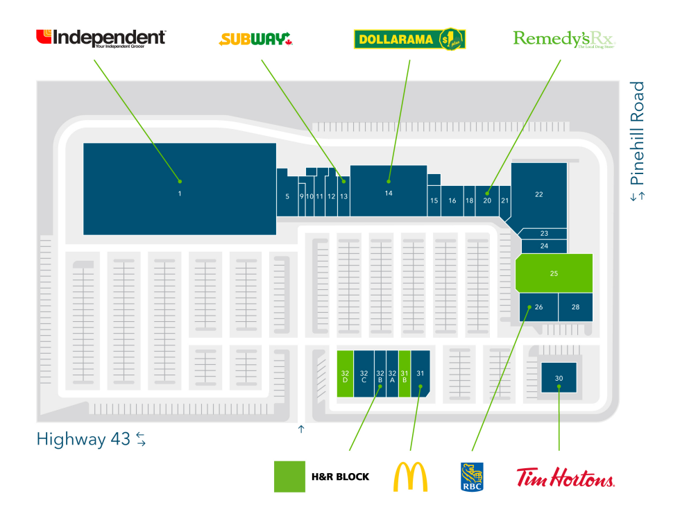 Located near the intersection of County Roads 43 and 44, the mall is anchored by Loblaws (YIG) and features high-traffic tenants including Dollarama, McDonald’s, Tim Hortons, RBC, and Kemptville Drug Mart, providing strong exposure and convenient access for shoppers.